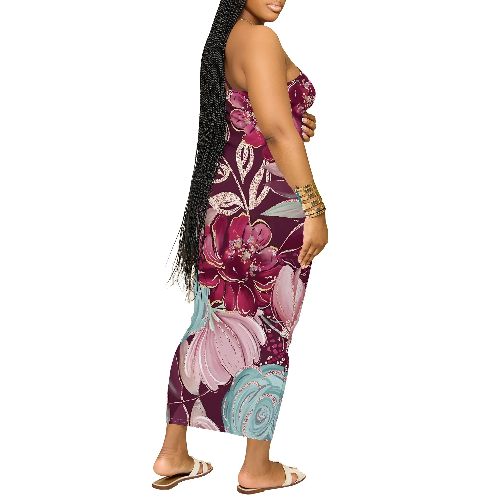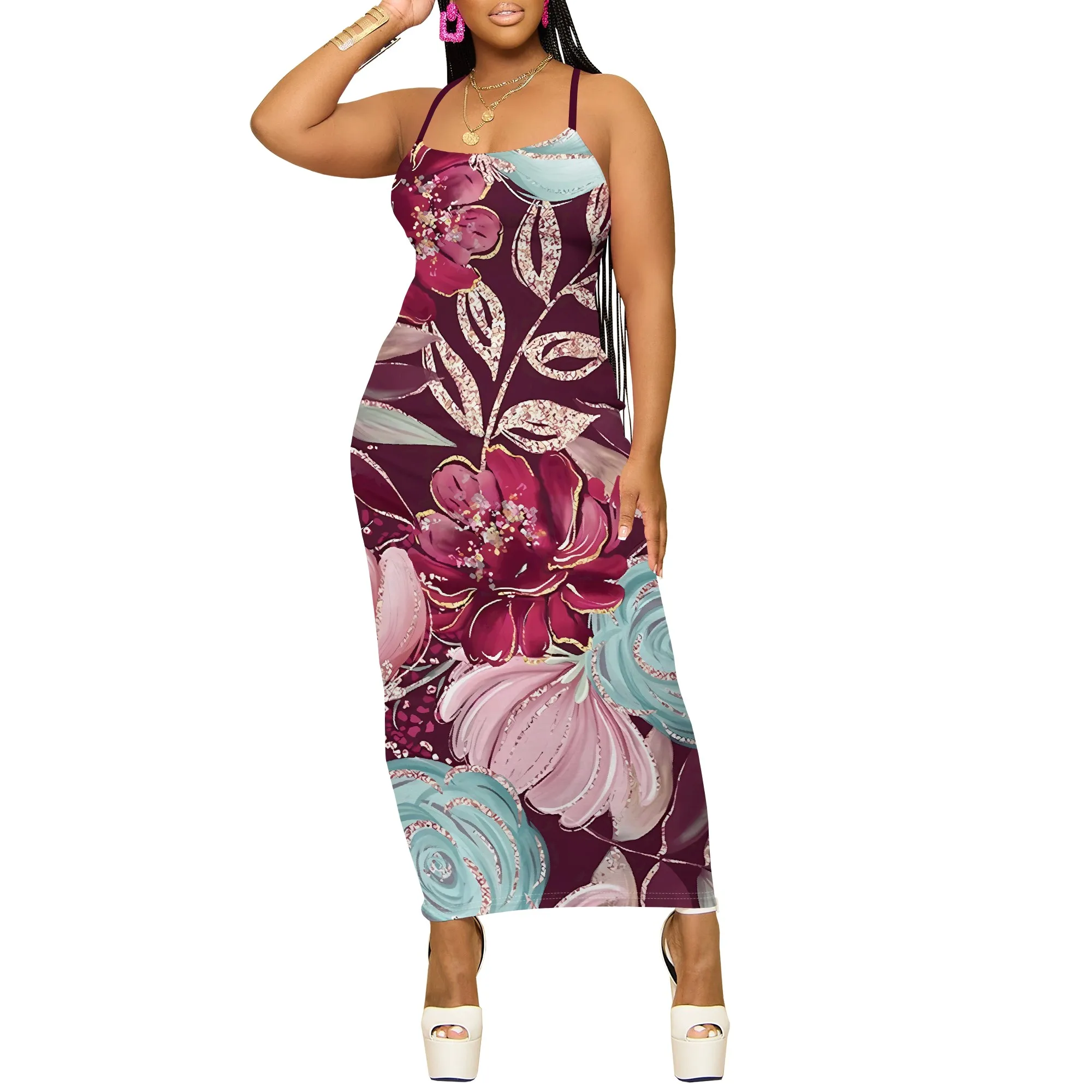 Vintage Floral Maxi Dress for Women Burgundy Spaghetti Strap Bodycon Sleeveless Summer Dress